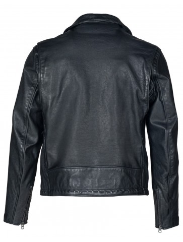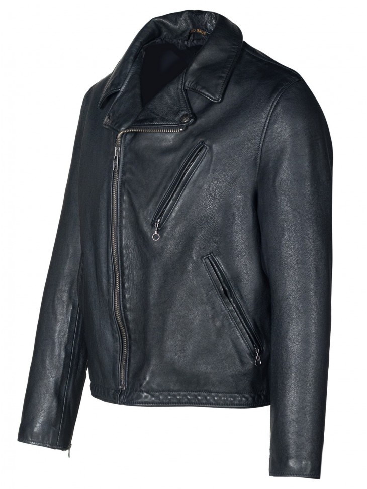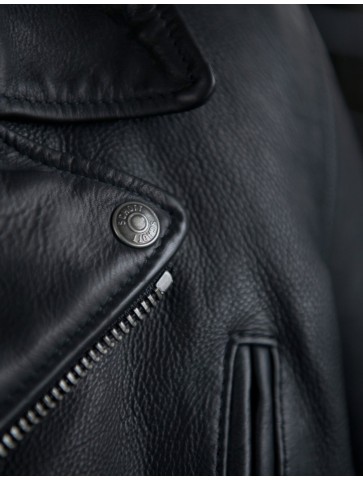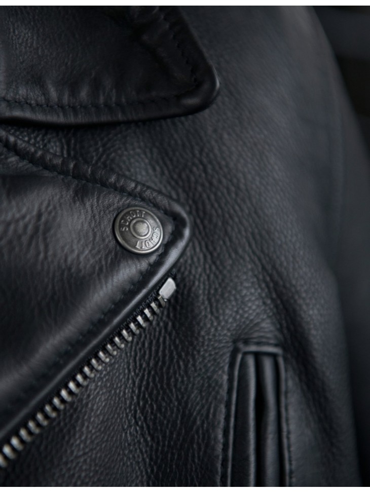 Men's 25” lightweight hand-vintaged waxy cowhide clean motorcycle jacket features asymmetrical front zipper, logo snaps, bi swing back and poly twill Schott logo lining