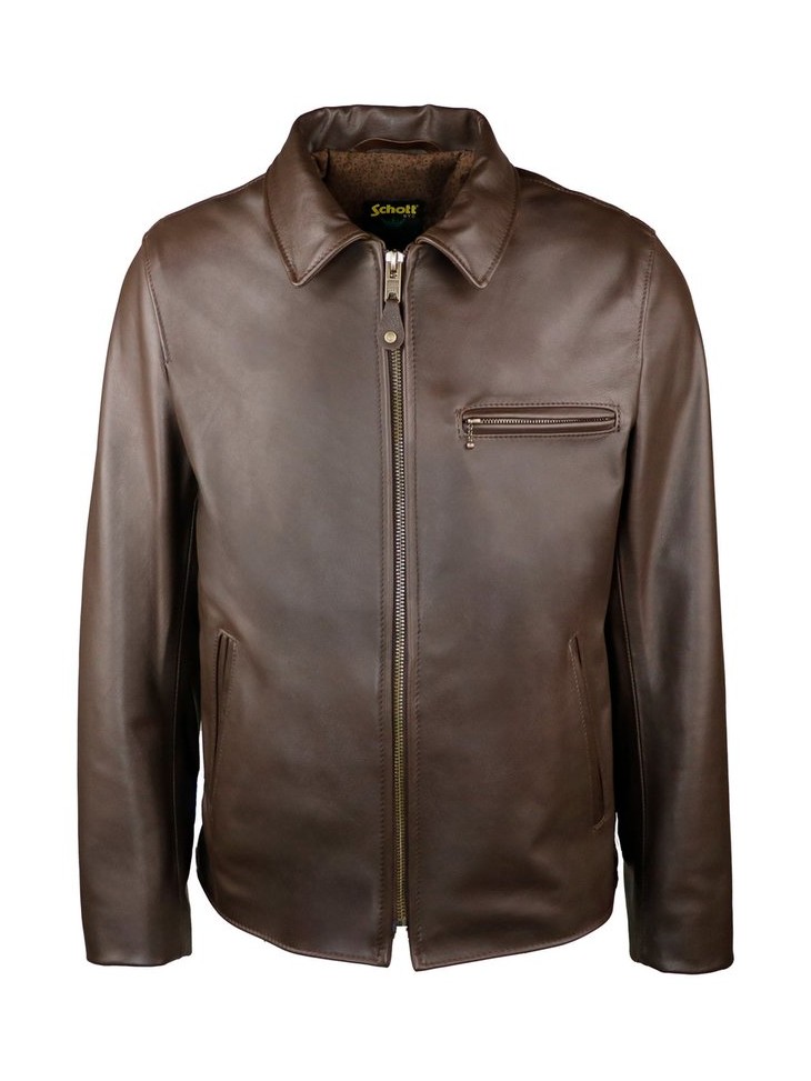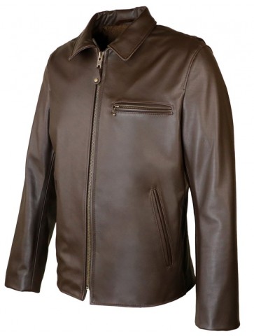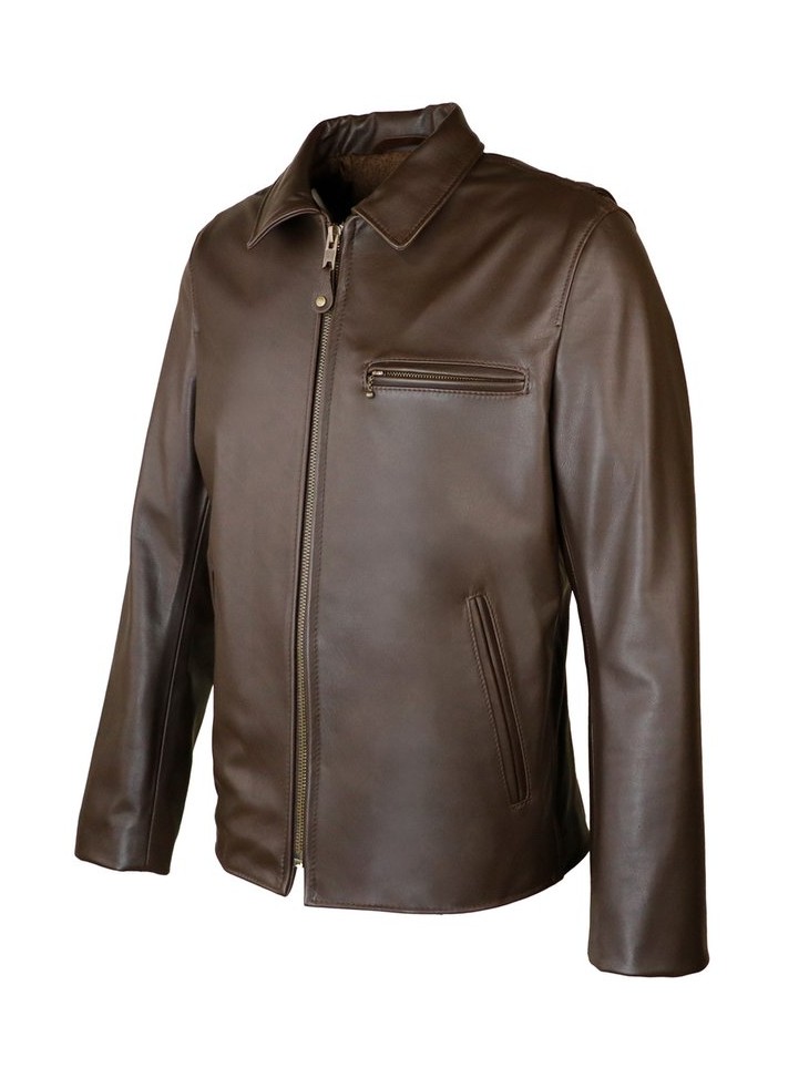 26" lightweight waxy cowhide delivery jacket with zip front closure, bi-swing back and 1 top zipper pocket with 2 side slash pockets no zipper. Features antique brass hardware and printed cotton lining.